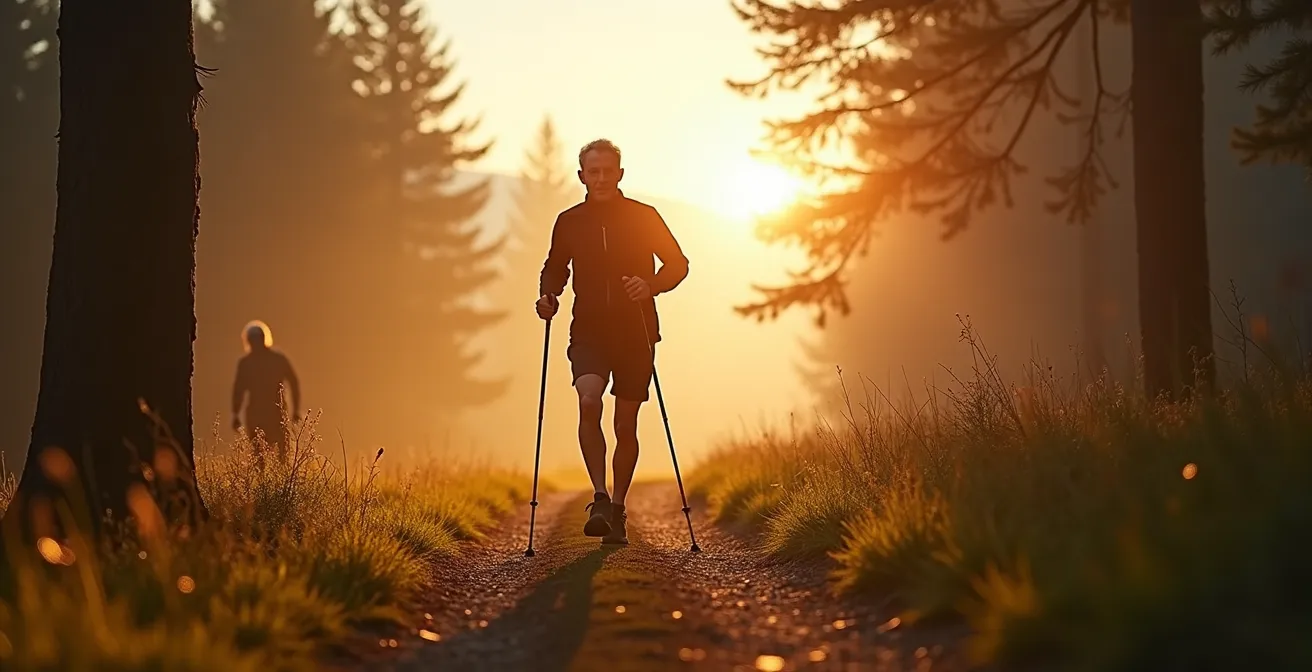 Die meisten Ratgeber bleiben an der Oberfläche, loben die Gelenkschonung und empfehlen bequeme Schuhe. Doch das kratzt nicht einmal an der Substanz. Die wahre Revolution des Nordic Walking liegt in der Bewegungseffizienz. Es geht darum, den Oberkörper gezielt einzusetzen, um Vortrieb zu erzeugen, die Herzfrequenz zu steigern und Muskelgruppen zu aktivieren, die beim normalen Gehen oder sogar beim Joggen vernachlässigt werden. Doch was, wenn die wahre Kunst nicht im Gehen, sondern im kraftvollen Abstoß liegt? Was, wenn die falsche Ausrüstung Ihre Gelenke mehr schädigt als schützt?